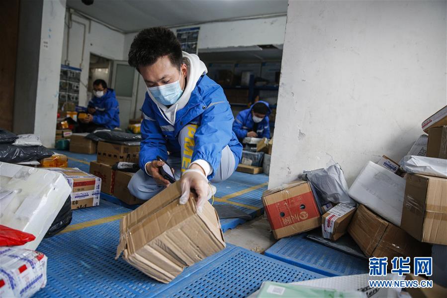 3月12日,李杰在中通快遞北京廠洼路網(wǎng)點(diǎn)分揀快遞包裹。新華社記者張玉薇攝
