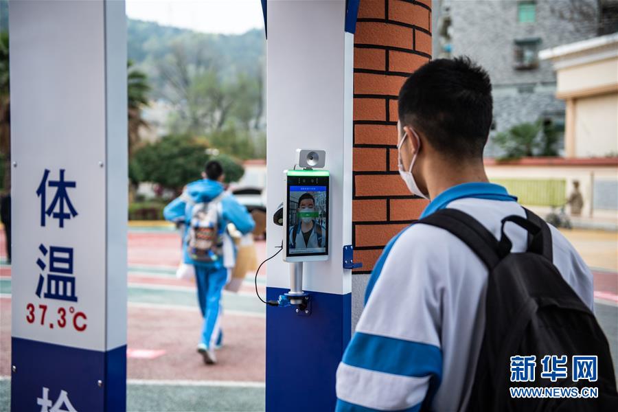 3月15日,烏當(dāng)中學(xué)高三學(xué)生在校門處測量體溫。 當(dāng)日,貴陽市烏當(dāng)中學(xué)部分高三學(xué)生有序返校,準(zhǔn)備恢復(fù)上課。據(jù)悉,貴州省高三年級和初三年級學(xué)生將于3月16日正式開學(xué)。 新華社記者 陶亮 攝