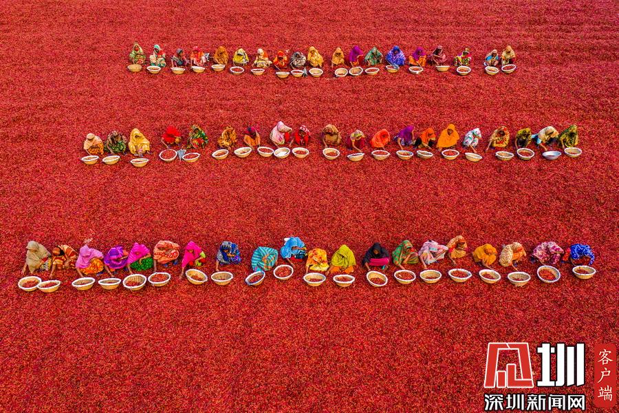 航拍孟加拉國(guó)工人分揀辣椒 滿眼火紅大地如鋪上地毯