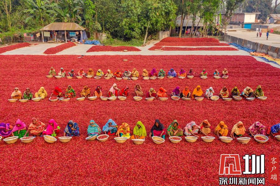 航拍孟加拉國(guó)工人分揀辣椒 滿眼火紅大地如鋪上地毯