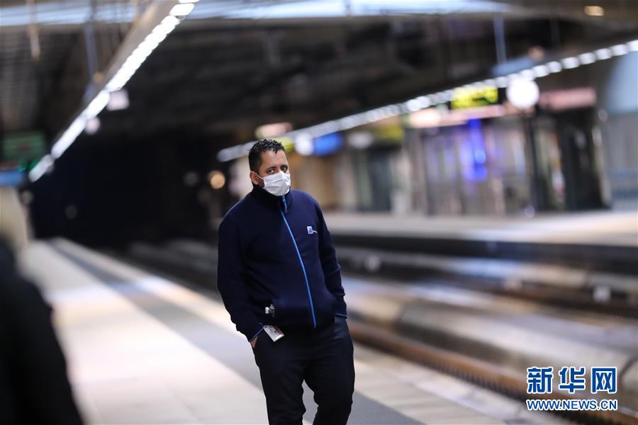 3月18日,在比利時布魯塞爾,一名佩戴口罩的男子在舒曼火車站等車。 新華社記者 張鋮 攝