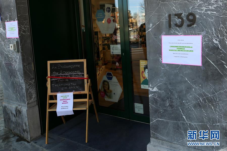 3月18日,在比利時布魯塞爾,一家藥店張貼的說明提示最多容納2名顧客同時進入。 新華社記者 張鋮 攝