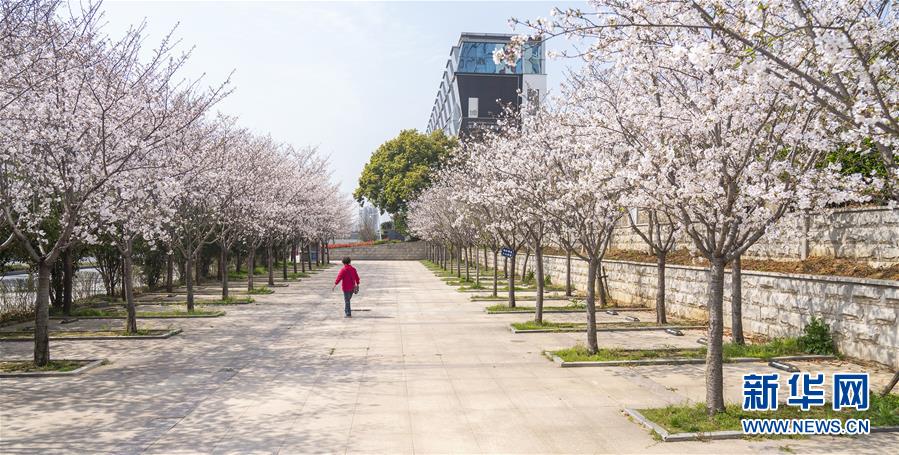 3月19日,在武漢市武昌區(qū)被網(wǎng)友稱為“武漢最美停車場(chǎng)”的湖北日?qǐng)?bào)停車場(chǎng),一名工作人員從櫻花樹邊經(jīng)過(guò)。 新華社記者 才揚(yáng) 攝