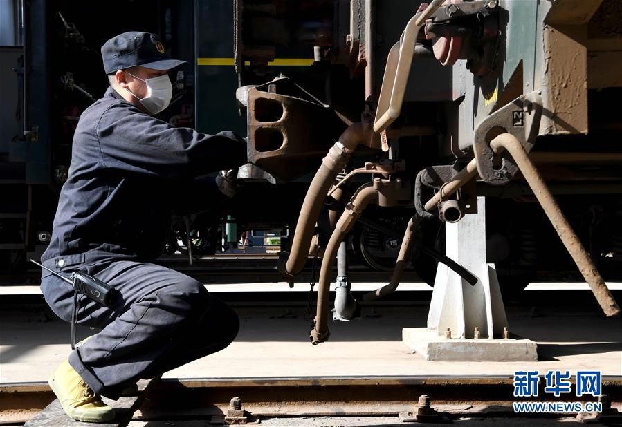 3月19日,鄭州車輛段客車檢車員在安裝客車車鉤。新華社記者 李安 攝