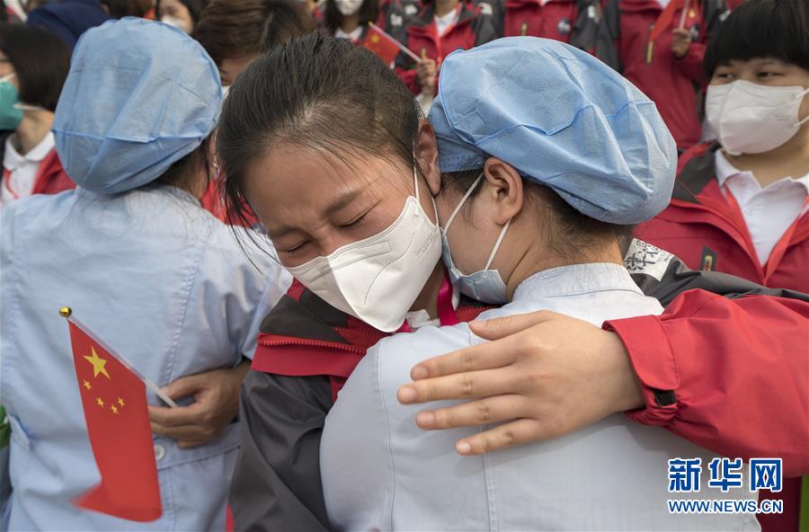 3月21日,武漢市第一醫(yī)院的桂欣(右)與天津市醫(yī)療隊隊員王勃昆擁抱道別。新華社記者費茂華攝