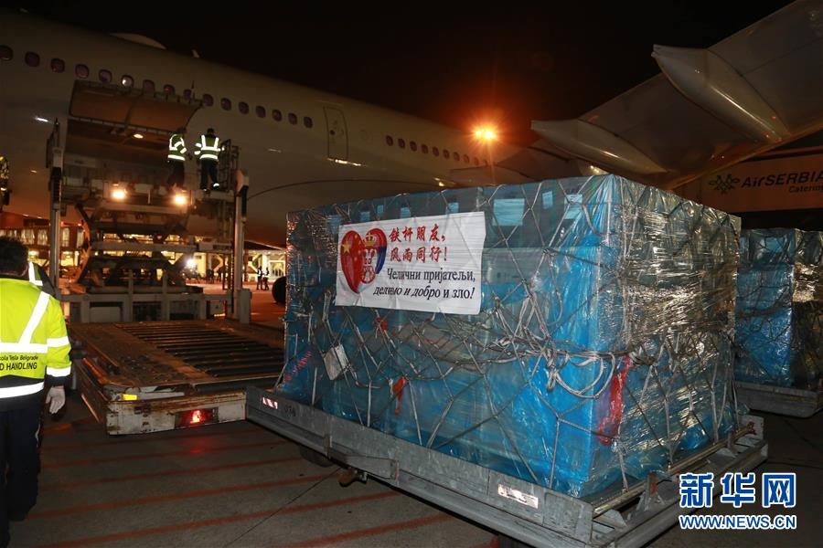 3月21日,在塞爾維亞首都貝爾格萊德,寫有 “鐵桿朋友,風(fēng)雨同行”字樣的中方捐贈醫(yī)療物資從飛機(jī)上卸下。 中國援助塞爾維亞抗疫醫(yī)療專家組一行6人21日晚乘專機(jī)抵達(dá)塞首都貝爾格萊德,由中國政府捐贈的一批醫(yī)療物資同機(jī)抵達(dá)。 新華社記者 石中玉 攝