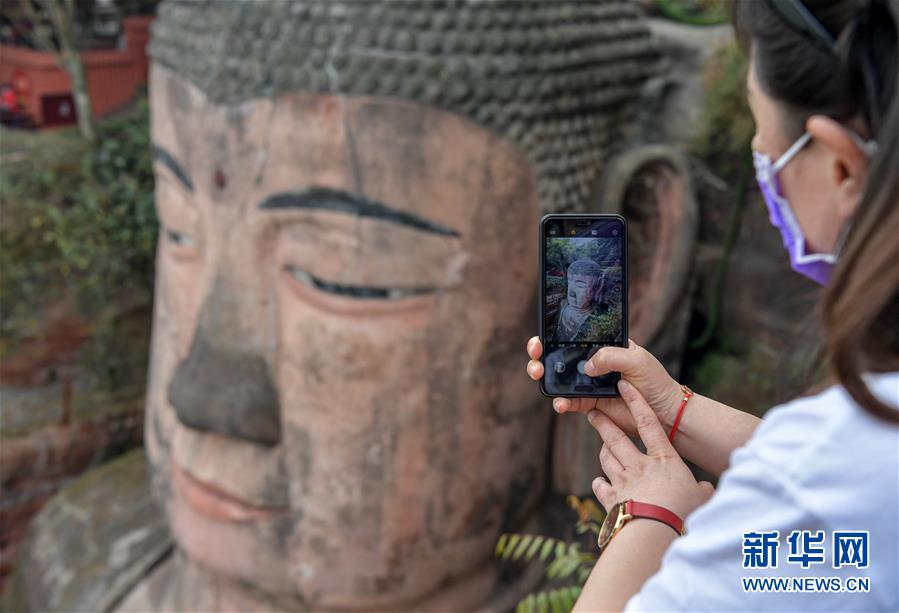 3月23日,一位游客在樂(lè)山大佛景區(qū)內(nèi)用手機(jī)拍攝。新華社記者張超群攝