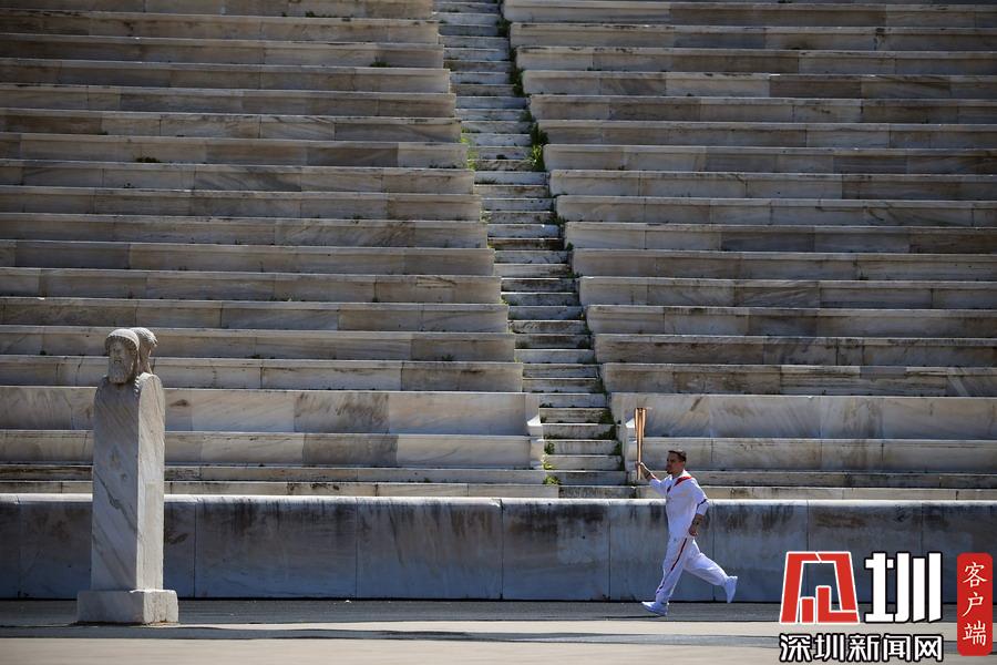 3月19日,最后一名火炬手里約奧運會女子撐桿跳高冠軍、希臘運動員卡特琳娜·斯特凡尼季手持圣火火炬跑向終點。