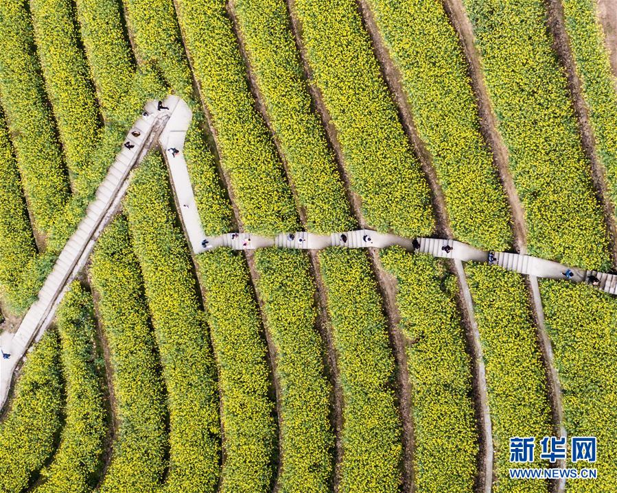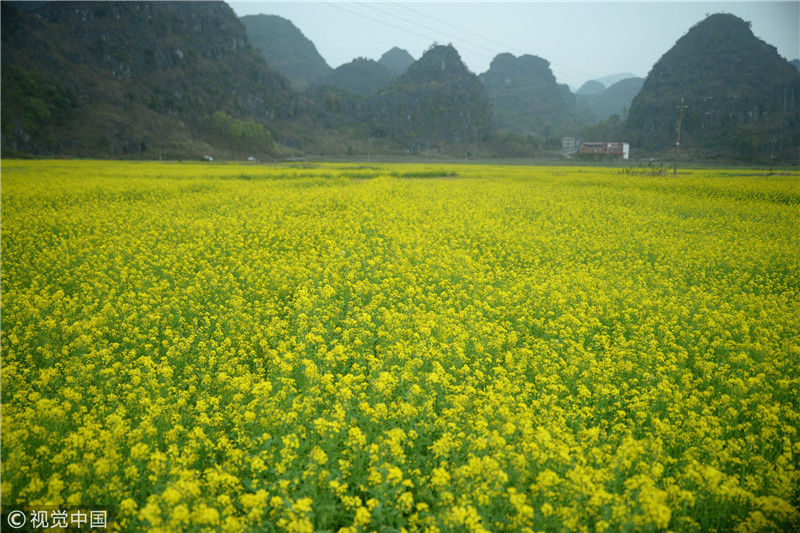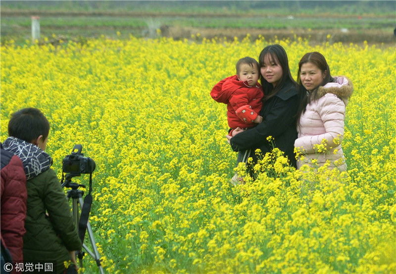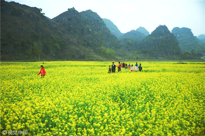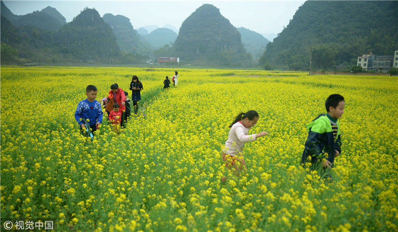 2019年2月5日,春節(jié)期間,廣西來賓市忻城縣萬余畝油菜花競相綻放,吸引眾多游客前來賞花游玩,感受春天的氣息。近年來,廣西忻城縣大力實施鄉(xiāng)村振興戰(zhàn)略,注重發(fā)展鄉(xiāng)村旅游產(chǎn)業(yè),把鄉(xiāng)村旅游與美麗鄉(xiāng)村、脫貧攻堅緊密結(jié)合起來,輻射帶動當?shù)刎毨裘撠氈赂弧7B光/視覺中國