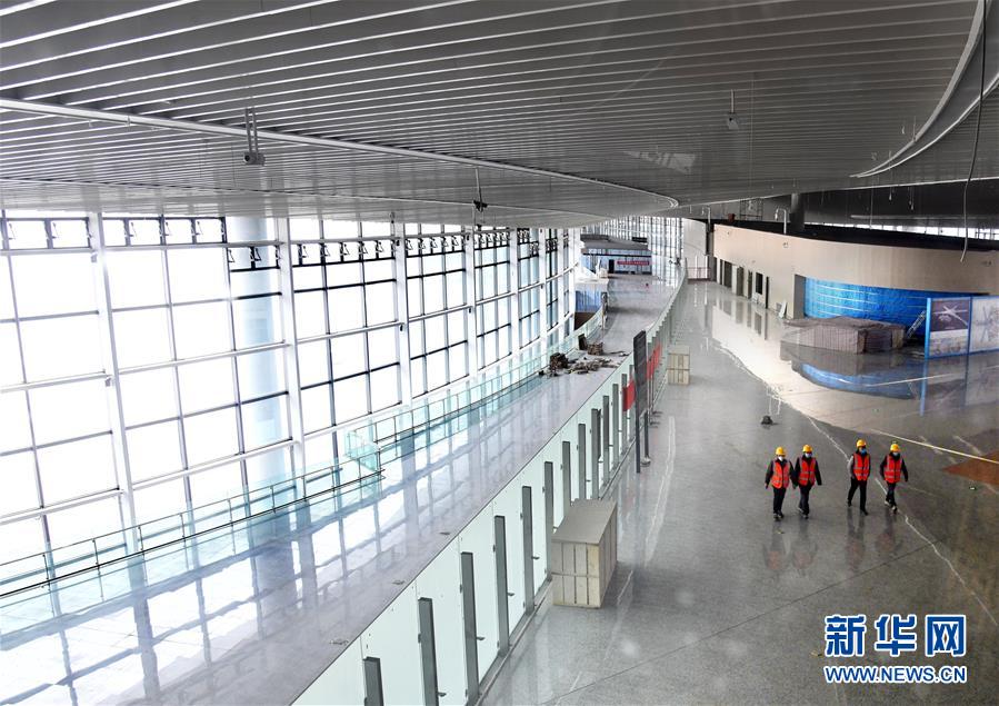 3月25日,幾名工人從建設(shè)中的青島膠東國際機(jī)場航站樓出發(fā)大廳走過。新華社記者李紫恒攝