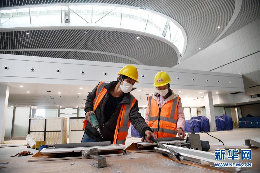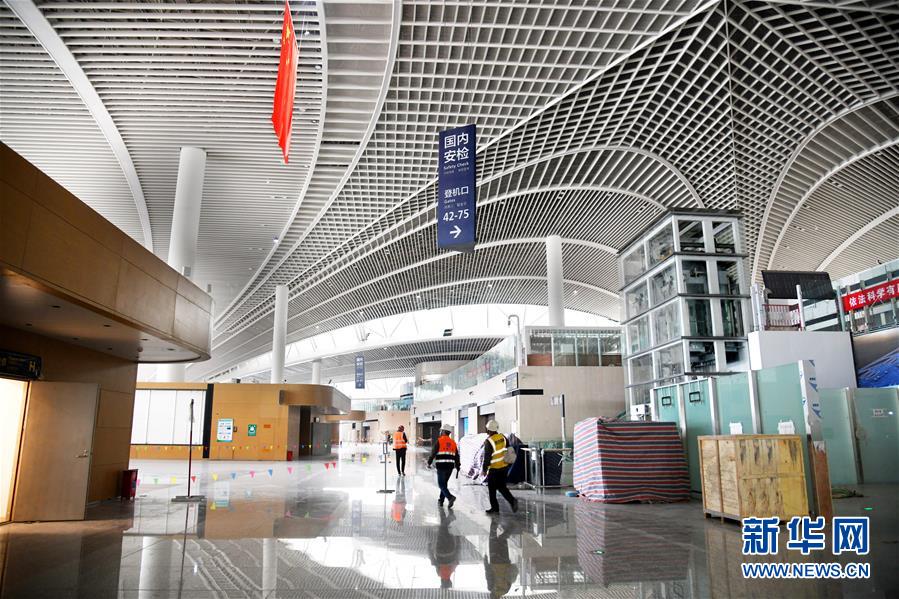 3月25日,兩名工人從建設(shè)中的青島膠東國際機(jī)場航站樓出發(fā)大廳走過。新華社記者李紫恒攝
