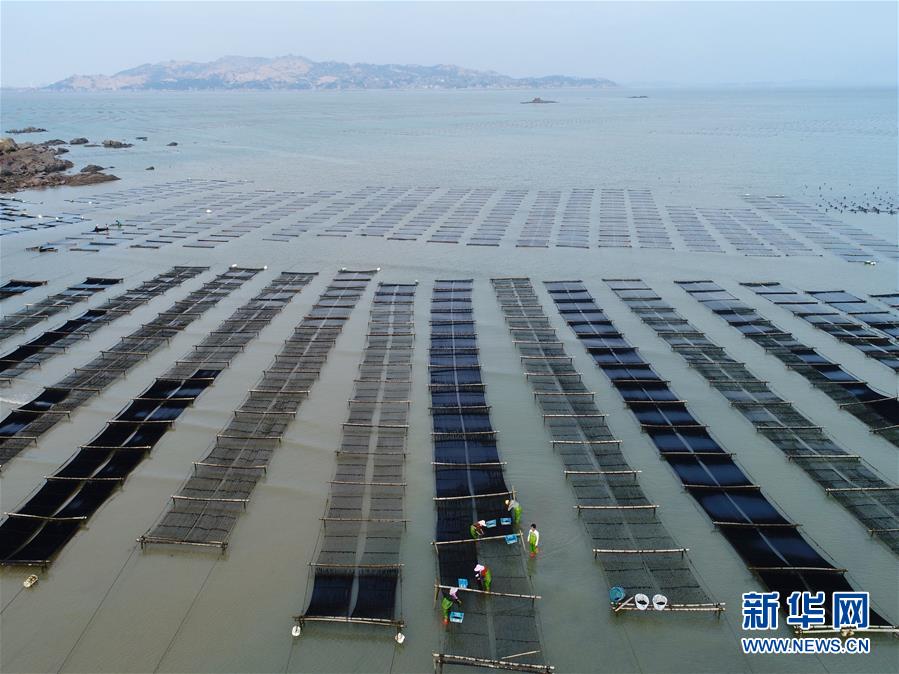 近日,福建省莆田市湄洲灣北岸蔣山村的2000多畝種植紫菜進(jìn)入收割旺季,當(dāng)?shù)卮迕駬屖疹^水紫菜。蔣山村現(xiàn)有200多家紫菜種植戶,紫菜種植成為當(dāng)?shù)卮迕裨鍪罩赂坏闹饕a(chǎn)業(yè)。