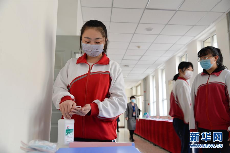 3月30日,學生在呼和浩特市第六中學教室外的走廊上使用免洗洗手液。當日,內蒙古自治區(qū)全區(qū)高三和初三年級開學復課。新華社記者徐欽攝