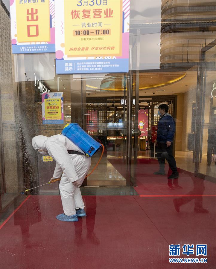 3月30日,在武商世貿(mào)廣場,工作人員在開門前進行最后的消殺工作。當(dāng)日,武漢市多家商場開門迎客。新華社記者費茂華攝