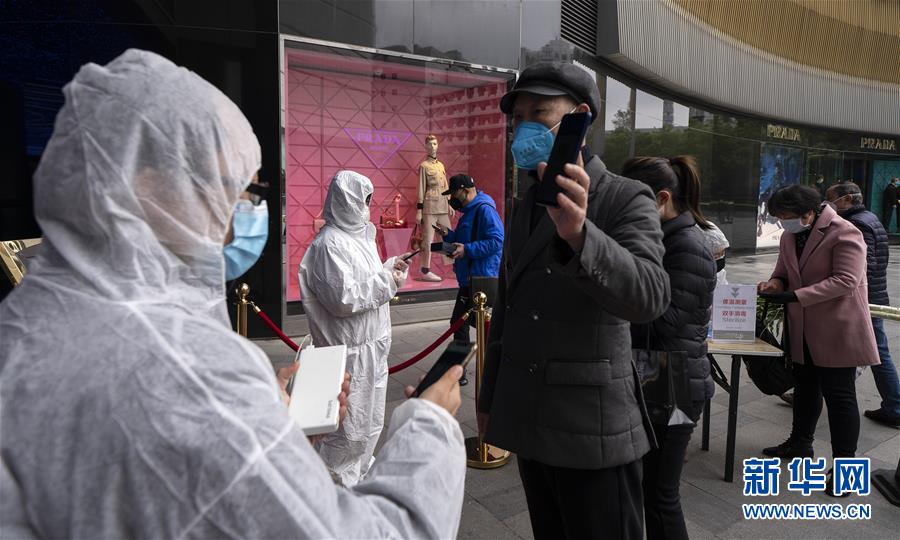3月30日,在武商國際廣場的超市門口,顧客向工作人員出示健康碼。當(dāng)日,武漢市多家商場開門迎客。新華社記者費(fèi)茂華攝
