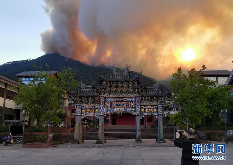 這是3月31日在四川省西昌市邛海畔拍攝的瀘山火場畫面。新華社記者惠小勇攝