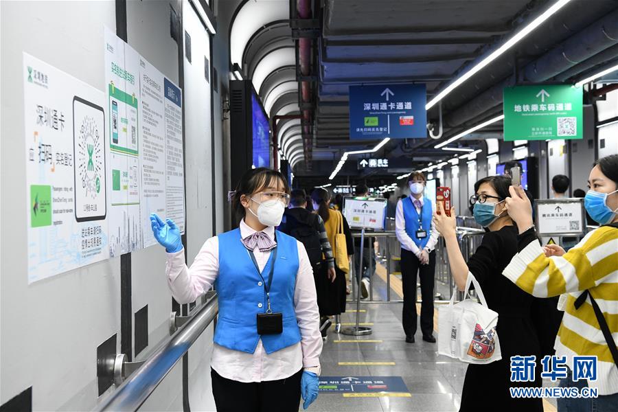3月18日晚高峰時段,在深圳地鐵車公廟站,乘客掃描二維碼進行實名登記。新華社記者梁旭攝