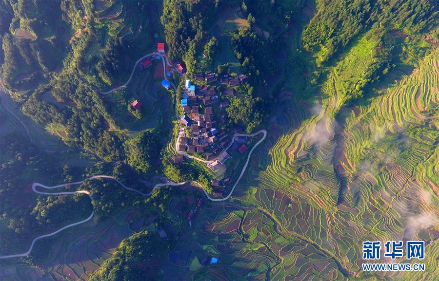 這是融水苗族自治縣桿洞鄉(xiāng)百秀村孔門苗寨的公路(6月14日無人機(jī)拍攝)。新華社記者黃孝邦攝