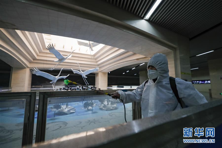3月23日,在漢口火車(chē)站地鐵站,保潔人員在為站廳消毒。新華社記者沈伯韓攝