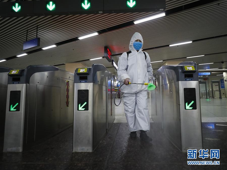 3月23日,在漢口火車(chē)站地鐵站,保潔人員在為站廳乘客通道消毒。目前,武漢城市功能和市民生活正逐步有序恢復(fù),地鐵、公交車(chē)系統(tǒng)已啟動(dòng)全面消殺和張貼乘客健康二維碼識(shí)別等舉措,為恢復(fù)運(yùn)營(yíng)做準(zhǔn)備。新華社記者沈伯韓攝