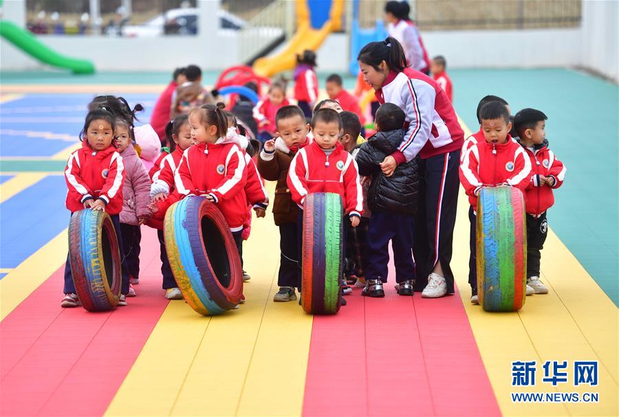 在融安縣遂融幼兒園,搬遷到縣城的孩子們?cè)趹?hù)外玩耍(2019年12月31日攝)。新華社記者黃孝邦攝
