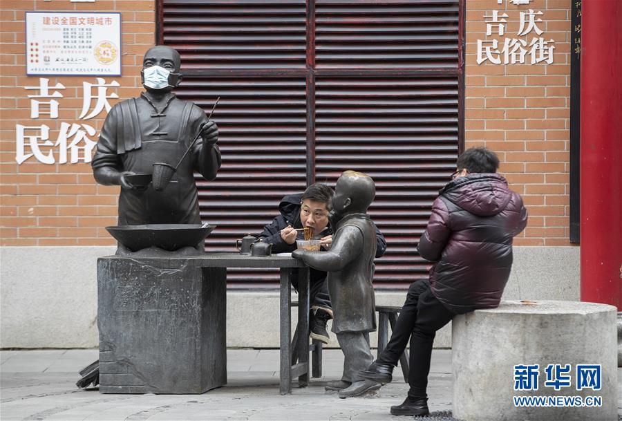 4月1日,市民在吉慶街街頭享用熱干面。新華社記者費茂華攝
