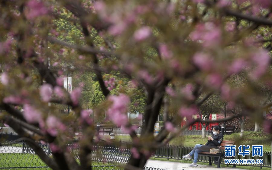3月25日,在武漢的一個街心花園,市民在長椅上休息。新華社記者費茂華攝