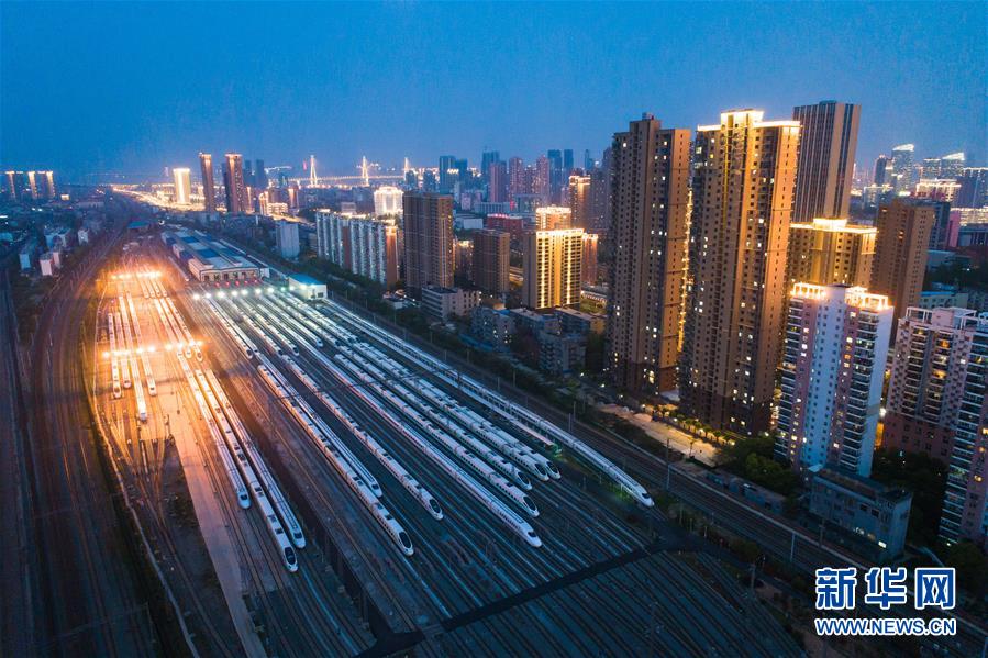 4月7日,在武漢動車段,列車??吭诖孳嚲€上(無人機照片)。 新華社記者 肖藝九 攝