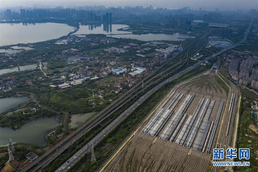 4月7日,在武漢動(dòng)車段,列車停靠在存車線上(無人機(jī)照片)。新華社記者 沈伯韓 攝