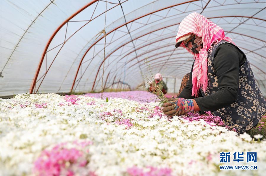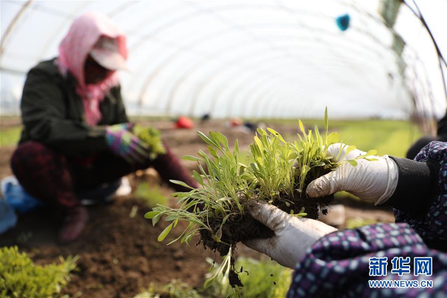4月13日,花農在八角臺街道雅化村一塊花圃內分揀培育好的花苗。新華社記者姚劍鋒攝