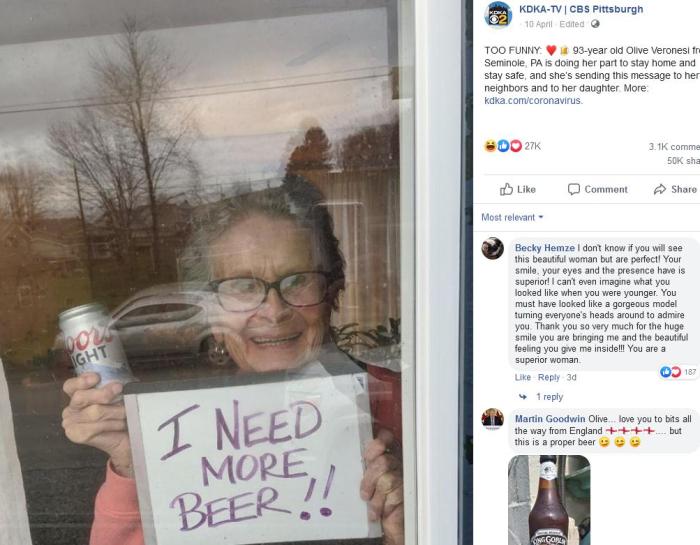居家避疫的93歲老太舉牌“我要啤酒”,廠商送來150罐