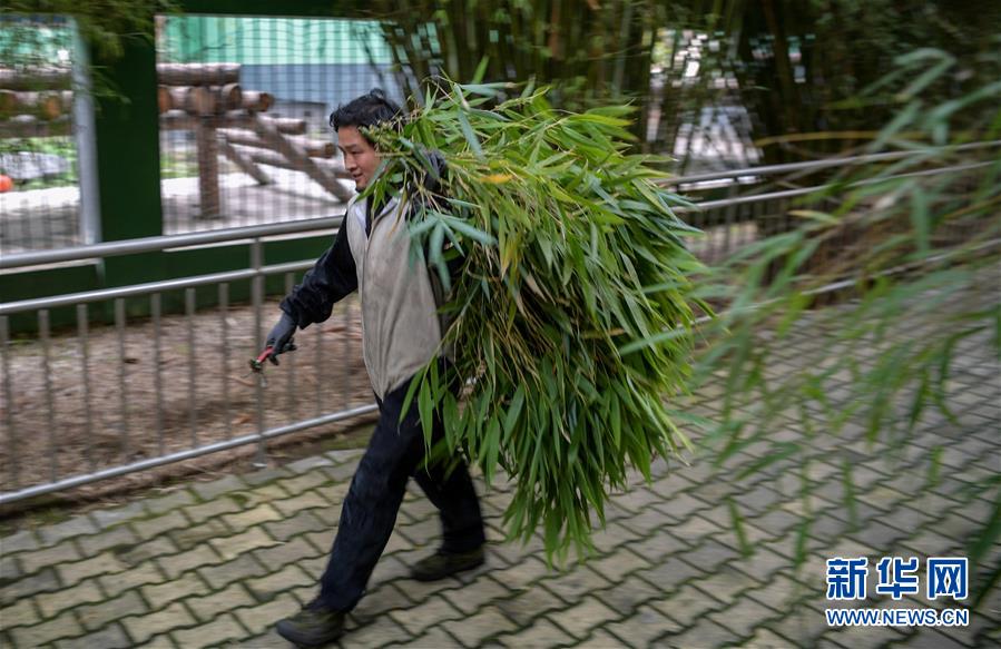 4月14日,中國(guó)大熊貓保護(hù)研究中心核桃坪基地的飼養(yǎng)員周季秋在準(zhǔn)備供大熊貓食用的竹子。新華社記者張超群攝