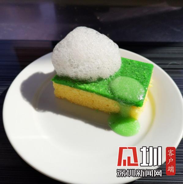 洗碗海綿形狀的蛋糕。其實(shí)是橄欖油蛋糕,上面撒上薄荷面包屑,再配上牛奶泡沫和蘋果泥。