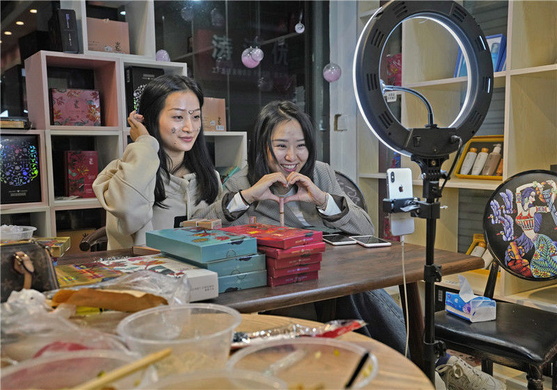 2019年11月10日,浙江金華,義烏北下朱村,倆主播在銷售化妝品,一個(gè)主播做出愛(ài)心的手型,對(duì)她們的“老鐵”(粉絲)示好。