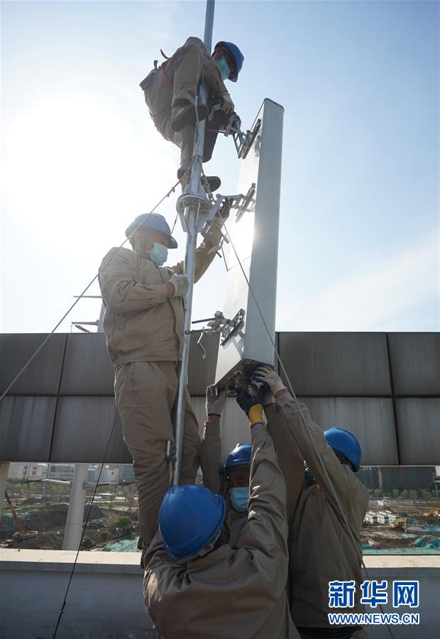 4月25日,在南京220千伏城南河變電站屋頂,工人在架設(shè)4G設(shè)備。當(dāng)日,三大通信運(yùn)營(yíng)商的2座5G、3座4G基站建設(shè)工作在南京220千伏城南河變電站屋頂有序展開。在變電站內(nèi)建設(shè)基站可有效利用電網(wǎng)資源,縮短建設(shè)周期,節(jié)約建設(shè)成本。新華社記者季春鵬攝