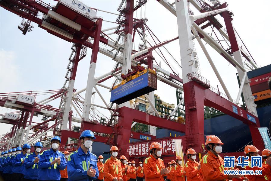 4月26日,在青島港前灣碼頭,碼頭工人參加“現(xiàn)代商船阿爾赫西拉斯”輪首航儀式。當(dāng)日,載箱量可達(dá)2.4萬標(biāo)準(zhǔn)箱的世界最大集裝箱船“現(xiàn)代商船阿爾赫西拉斯”輪從山東青島港開啟首航,這條船的甲板面積超過2.4萬平方米,相當(dāng)于3.5個(gè)標(biāo)準(zhǔn)足球場大小。新華社記者李紫恒攝