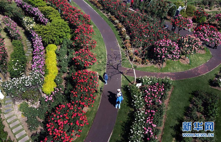 4月28日,游人在上海辰山植物園的月季島上賞花(無(wú)人機(jī)照片)。近日,上海迎來(lái)月季花期,上海辰山植物園的月季島上,各色月季競(jìng)相綻放,形成絢爛花海。新華社記者劉穎攝