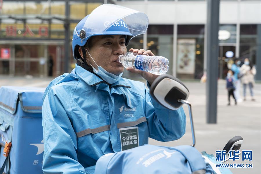4月22日,在四川省成都市一家商場門前,邱有哈子在送餐間隙喝水休息。新華社記者 李夢馨 攝