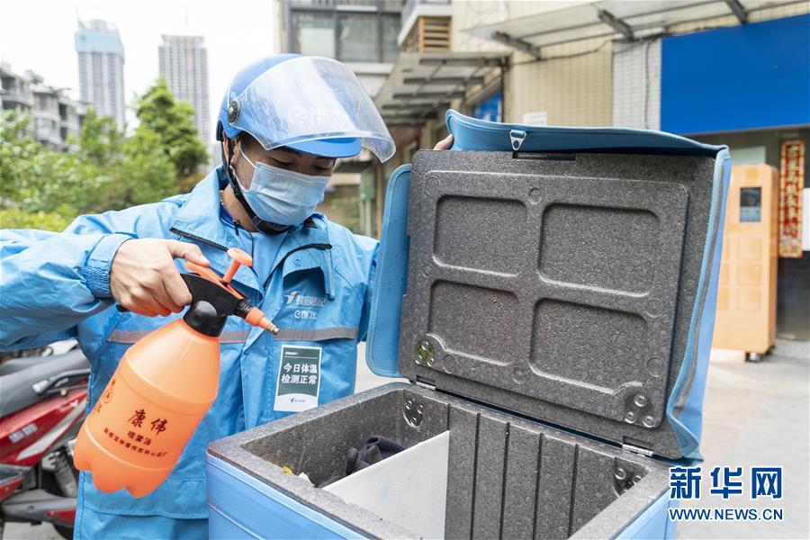 4月22日,在四川省成都市的一家外賣配送站點(diǎn),邱有哈子在給餐箱消毒。新華社記者 李夢馨 攝