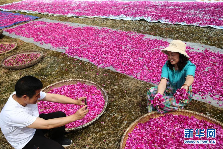 5月1日,游客在重慶市黔江區(qū)沙壩鎮(zhèn)天香玫瑰莊園體驗(yàn)晾曬玫瑰花瓣。“五一”假日期間,人們以多種方式放松心情、享受假日。新華社發(fā)(楊敏攝)