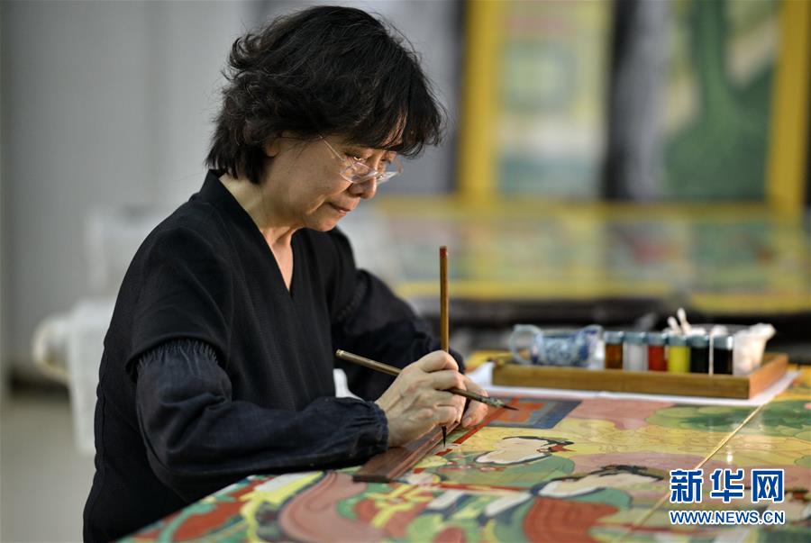 5月4日,工藝美術(shù)大師胡昕在進行屏風(fēng)畫面最后的檢視修補。