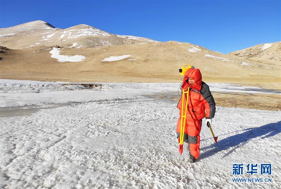 國測一大隊隊員霍申申在西藏定日縣扎西宗鄉(xiāng)境內(nèi)進行水準測量(4月4日攝)。水準測量是一種利用提供水平視線的儀器(如水準儀、水準標尺),測定地面不同點之間的高差,并以此推算高度的一種方法,是經(jīng)典大地測量的重要技術(shù)之一。在目前正在進行的2020珠峰高程測量中,部分國測一大隊隊員承擔了水準測量的任務。新華社發(fā)(楊明攝)