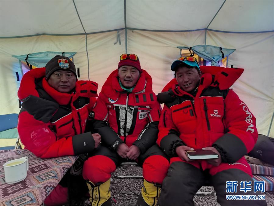 5月7日,在海拔6500米的珠峰前進(jìn)營地,測量登山隊隊長次洛(中)與旺青索朗(左)、魯達(dá)(右)在協(xié)調(diào)會議現(xiàn)場。新華社特約記者扎西次仁攝