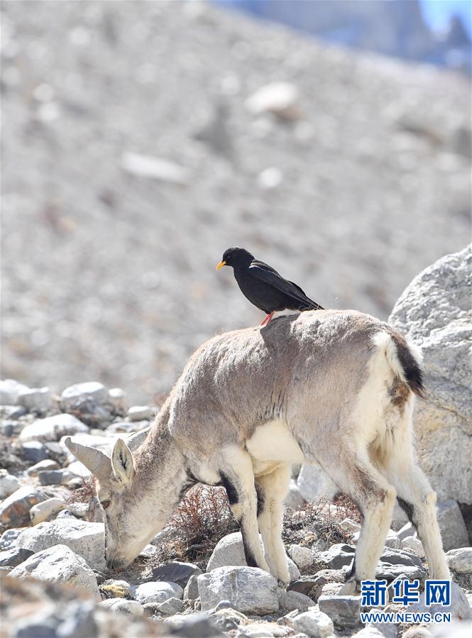 一只黃嘴山鴉停留在巖羊身上(5月8日攝)。當(dāng)日,一群巖羊在珠峰大本營(yíng)周?chē)捠?,黃嘴山鴉飛到巖羊身上停留,構(gòu)成一幅幅生動(dòng)有趣的雪域圖畫(huà)。新華社記者晉美多吉攝