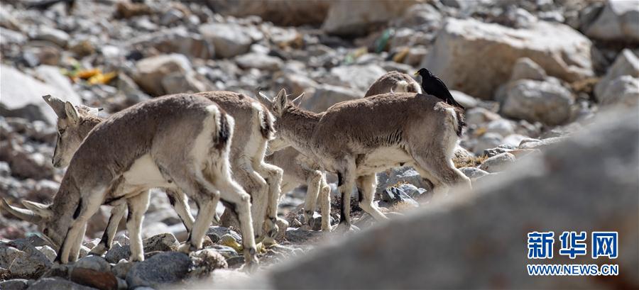 黃嘴山鴉停在巖羊背上(5月8日攝)。當(dāng)日,一群巖羊在珠峰大本營周圍覓食,黃嘴山鴉飛到巖羊身上停留,構(gòu)成一幅幅生動有趣的雪域圖畫。新華社記者普布扎西攝
