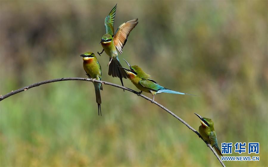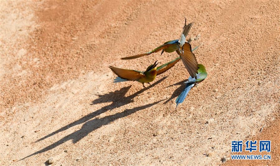 在??谖逶春酉掠畏浠⒈Wo小區(qū),栗喉蜂虎在嬉戲(5月7日攝)。新華社記者楊冠宇攝