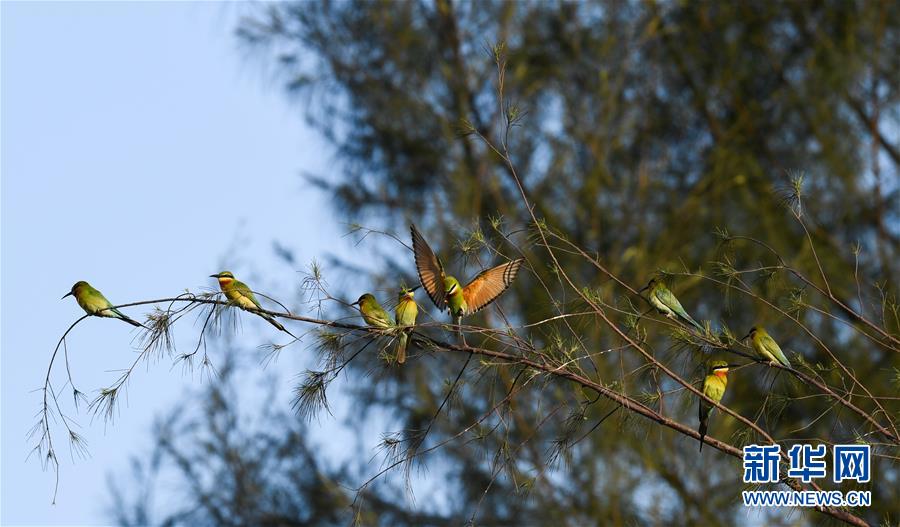 在海口五源河下游蜂虎保護(hù)小區(qū),栗喉蜂虎在樹枝上休息(5月7日攝)。新華社記者楊冠宇攝