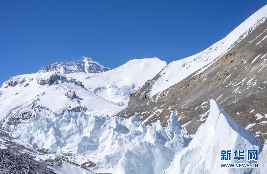 珠峰海拔5800米至海拔6500米的冰塔林(5月9日攝)。從海拔5800米的珠峰過渡營(yíng)地到海拔6500米的前進(jìn)營(yíng)地,冰塔林沿山谷排列,蔚為壯觀。新華社記者孫非攝