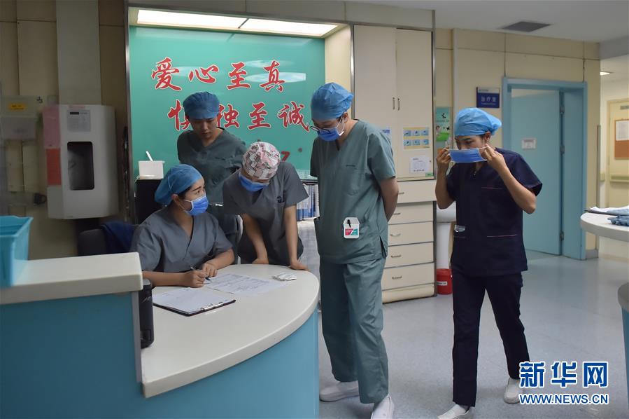 5月11日,在北京地壇醫(yī)院感染二科護士站,白班護士高齊(右)與晚班護士劉印懷交接工作。北京地壇醫(yī)院是北京市收治新冠肺炎患者的定點醫(yī)院之一,醫(yī)院的醫(yī)護人員一直奮戰(zhàn)在抗擊疫情的一線。在國際護士節(jié)前夕,記者前往北京地壇醫(yī)院,記錄下抗疫一線護士的日常工作狀態(tài)。新華社記者彭子洋攝