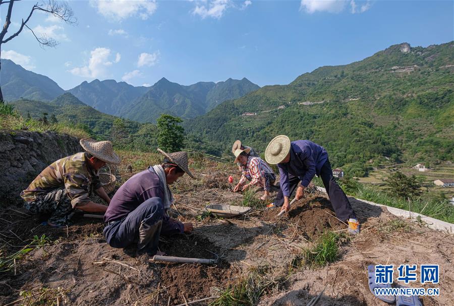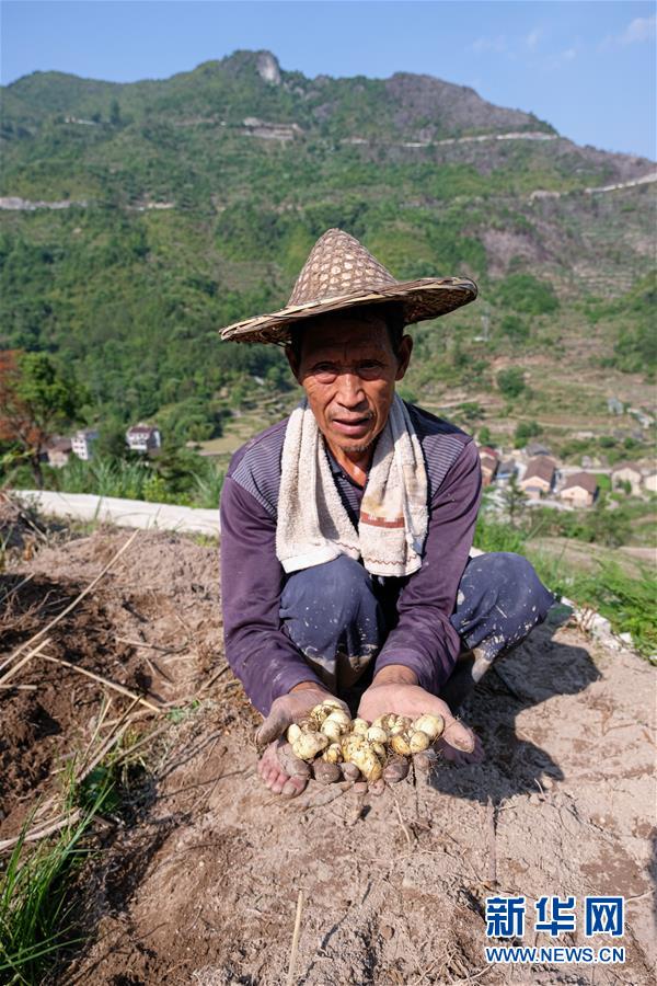 5月12日,青田縣巨浦鄉(xiāng)西坑村的村民在梯田收獲中藥貝母。當?shù)夭扇『献魃缂懈N,冬春種中藥、夏秋種養(yǎng)水稻和田魚的方式,全面提升土地利用率和收益。新華社記者徐昱攝